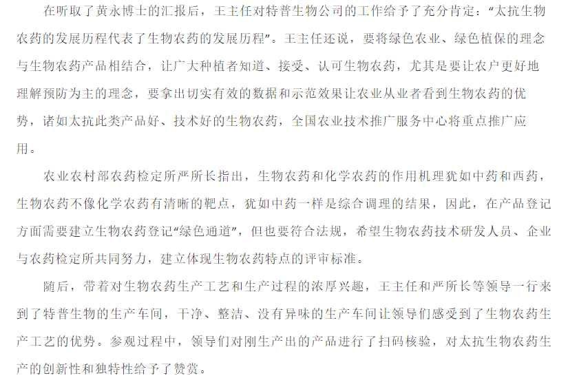 生物农药,未来农业发展的新希望 ——农业部领导一行调研特普生物